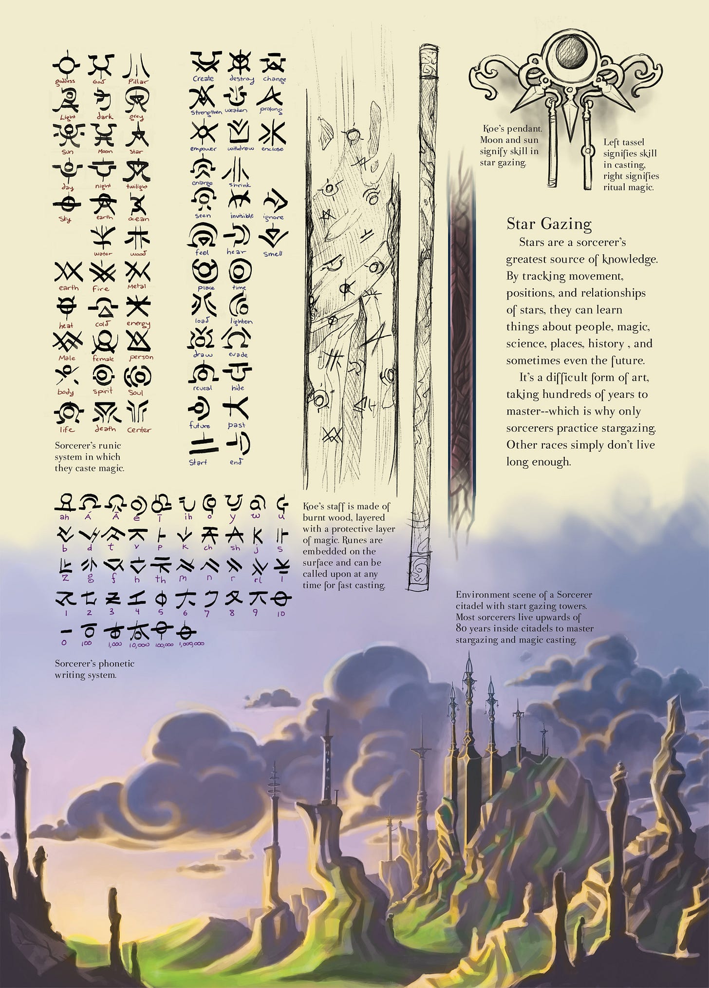 Since drawing this, I’ve added quite a few more runes to the alphabet, and I’ve developed the magic system a bit more. But for the most part, this is actually pretty accurate to where the story stands currently. So accurate that I needed to spoiler shield some of Koe’s page!
