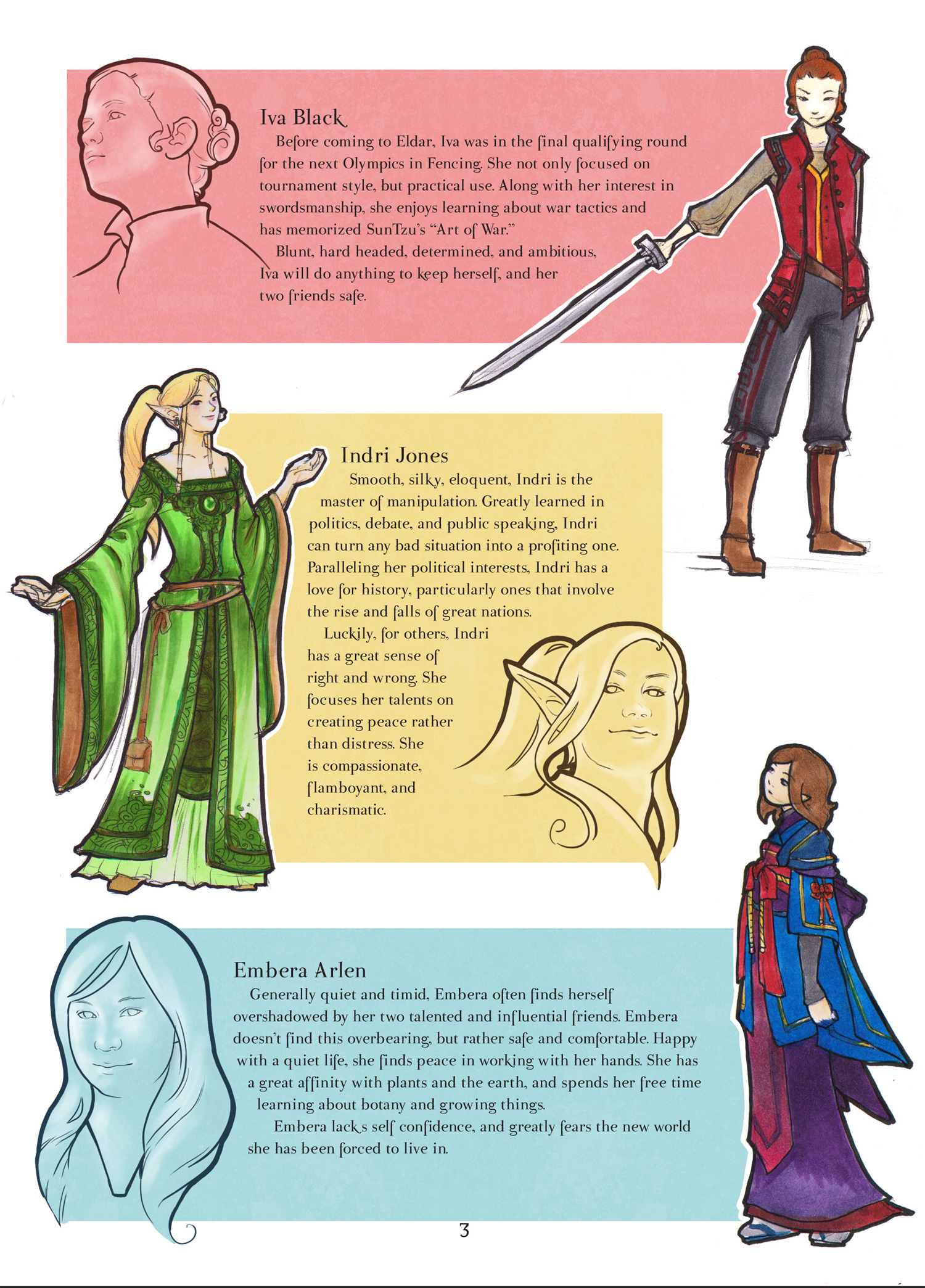 Designs for Iva, Indri, and Embera. These were not the first concept designs for these three girls, but the ones that I had in mind when I started the comic in 2011. The first time I drew these three was probably back in 2003 when I was in 7th grade, but bizarrely, I don’t think their designs changed a whole lot over that time. They even kept their original names! (Though I debated a lot on Indri’s, but couldn’t come up with anything better so it stuck. Lol) However, their elvan elements did change as Iva was originally the element of earth, Indri was fire, and Embera was wind.